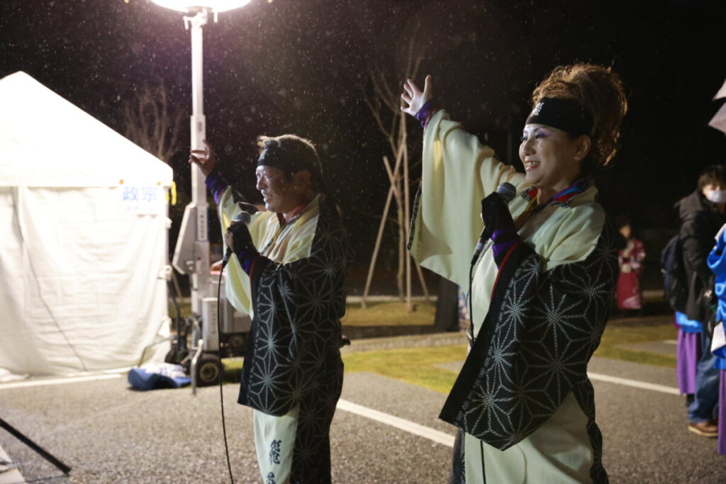 最終演舞です。先ほどの演舞から短時間ですっかり日が暮れました。正面撮影は照明機材からの順光が強烈で条件が厳しく、後ろからイメージカット的な撮り方を選択しました。