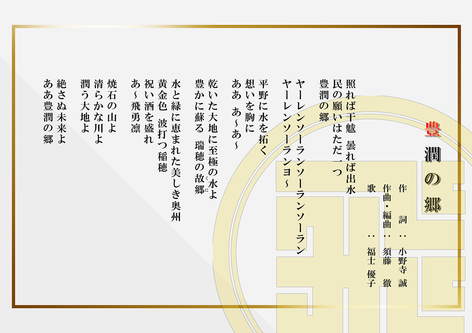 テーマは『恵みの水』先人たちの水を巡る闘いと焼石岳・胆沢川から流れ出る水を平野へ導き、豊かに発展して行く胆沢平野を表現。民謡は胆沢平野小唄。
