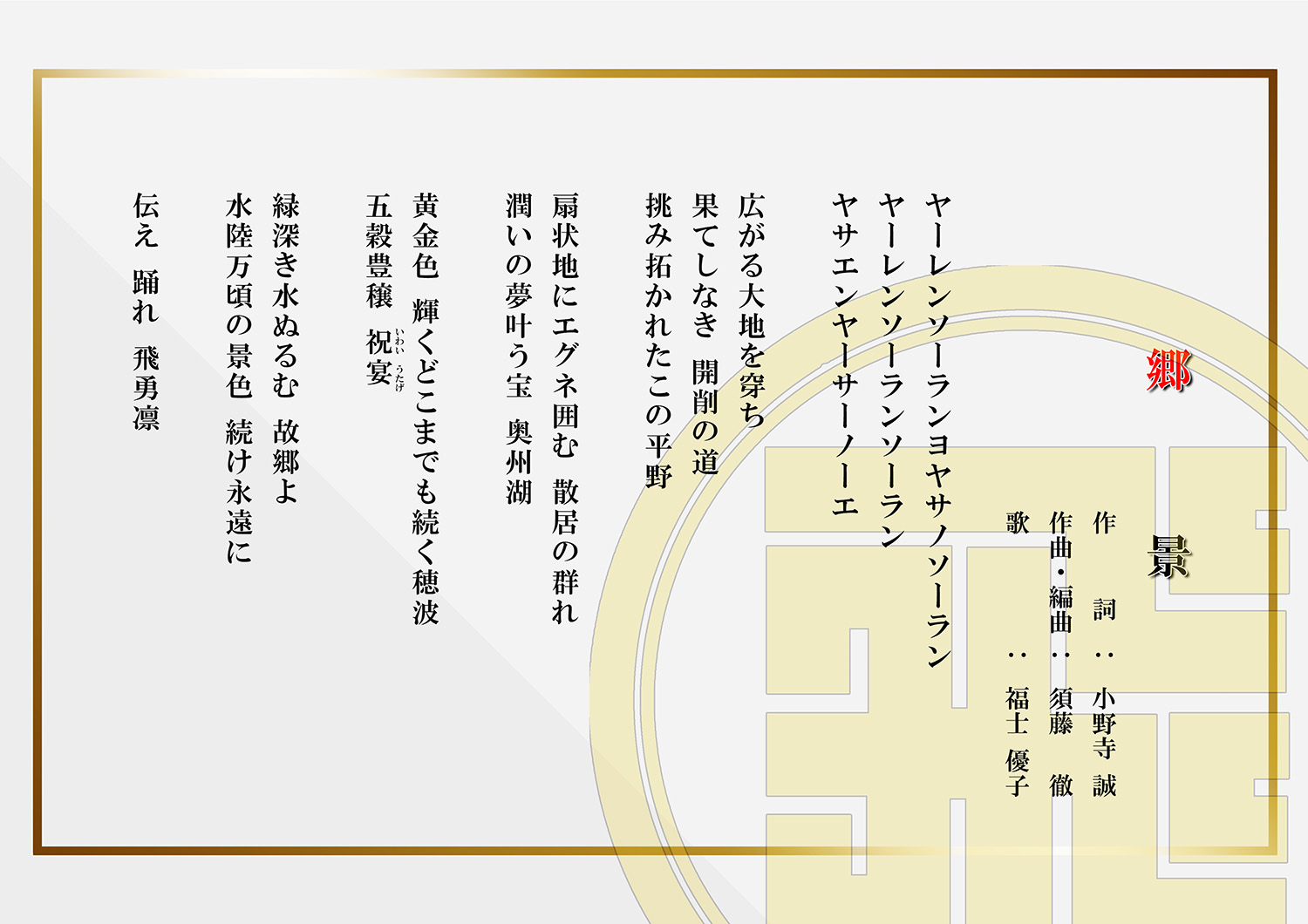 テーマは『いさわ』扇状地に広がる散居集落、水陸万頃と呼ばれる胆沢平野の景色を表現。