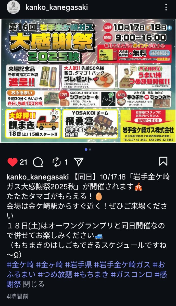 金ケ崎ガス大感謝祭2025秋 イベント詳細 日付: 2025年10月18日 カテゴリ: 02イベント 【場所】 岩手金ケ崎ガス株式会社(岩手県胆沢郡金ケ崎町西根町裏45番地1) 【時間】 飛勇凛の出番は「15時の餅撒きの後」とのことです。 情報ソース⇒金ケ崎観光協会instagram 2025年8月20日Posted by hiyu-rin