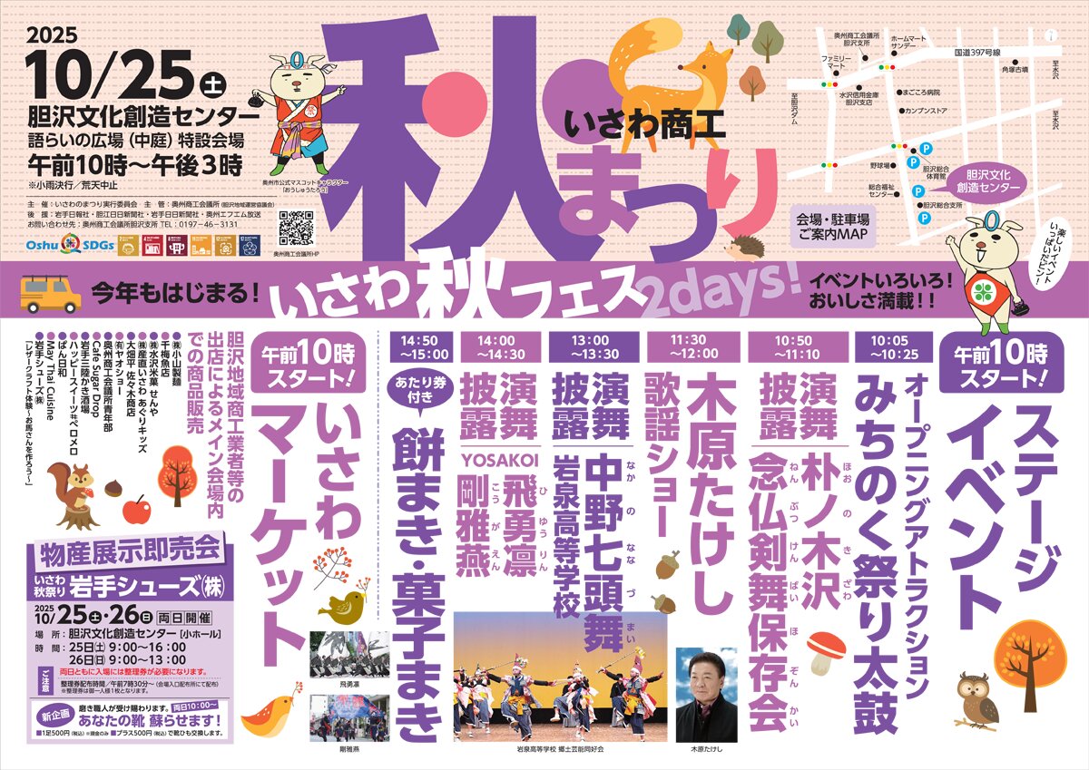 いさわ商工秋まつり イベント詳細 日付: 2025年10月25日 カテゴリ: 02イベント 【場所】胆沢文化創造センター(奥州市胆沢) 【日時】10月25日(土曜日) 14:00-14:30飛勇凛&剛雅燕 公式情報⇒おうしゅう旅浪漫 2025年8月20日Posted by hiyu-rin